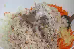 3. В миску с овощами переложить набухшие овсяные хлопья, добавить соль и специи, перемешать.