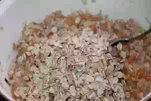4. Затем всыпать оставшиеся сухие овсяные хлопьев. Так масса будет более густой, и из неё легче будет формовать котлеты.