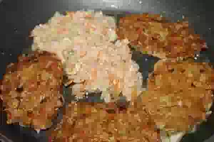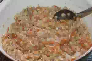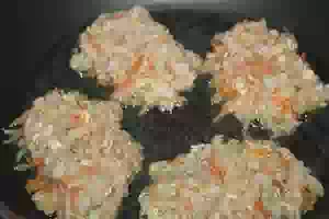 6. Все хорошо перемешать. Постные овсяные котлеты с картофелем , Шаг 06 В сковороде разогреть растительное масло и выкладывать столовой ложкой массу из набухшей овсянки с тертыми сырыми овощами.
