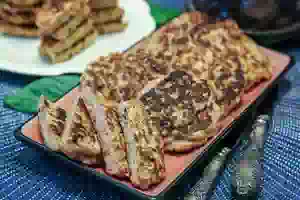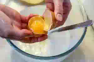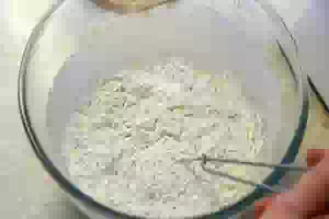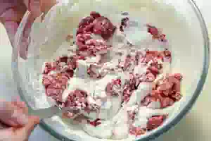 6. В тесто по частям добавить мясной фарш, хорошо размешивая после каждой порции. Продолжать размешивать, пока фарш равномерно не распределится по тесту.