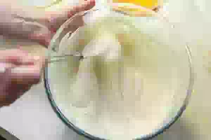 1. Приготовить тесто на кефире, которое будет основой для мясных оладий. Для этого налить в миску кефир комнатной температуры, добавить соду, яйцо, сахар и соль.