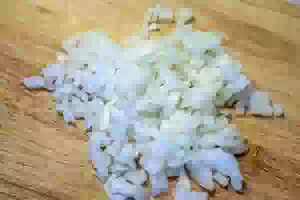 4. Подготовить овощи, которые будем добавлять в мясной фарш для оладий. Лук очистить и мелко нарезать.