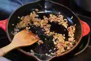 5. В сковороде разогреть растительное масло и обжарить лук. Жареный лук переложить на тарелку, даль ему остыть.