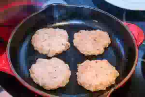 8. Разогреть сковороду, смазать растительным маслом и выкладывать тесто с мясным фаршем по столовой ложке. Будет проще это делать, если сначала ложку намочить в холодной воде. Прикрыть сковороду с мясными оладьями крышкой и жарить на слабом огне сначала с одной стороны, затем перевернуть оладьи и продолжить жарить с другой стороны до золотистой корочки. Готовые мясные оладьи на кефире подавать горячими или остывшими как гарнир или закуску.