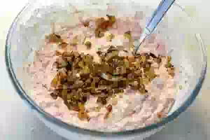 6. В тесто по частям добавить мясной фарш, хорошо размешивая после каждой порции. Продолжать размешивать, пока фарш равномерно не распределится по тесту.