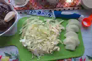 1. Как приготовить оладьи из печени с капустой и манкой. Если есть подозрения, что печень отдает горечью, то необходимо перед готовкой вымочить ее в молоке в течение часа (можно и дольше). Луковицу очистим и порежем полукольцами. Капусту нашинкуем соломкой.