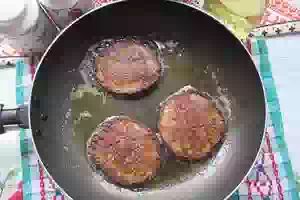 6. В сковороду нальем масло. Оно должно покрыть дно сковороды примерно на 2 мм высотой. Масло хорошенько прогреем. Затем, уменьшив огонь, выложим в раскаленное масло небольшие лепешки из подготовленного печеночного «теста» (примерно по полторы столовые ложки).