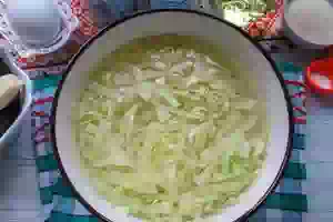 2. Затем капусту вместе с нарезкой из лука зальем кипятком и, накрыв крышкой (либо колпаком для заварочного чайника), минут на десять отставим в сторону. Благодаря этой процедуре из овощей выйдет горечь. Кроме того, они станут немного мягче.