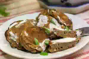 9. Готовые печеночные оладьи смазать сметаной, сложить слоями в сковороду и прогреть на маленьком огне 3-5 минут. Пышные печеночные оладьи станут от этого еще вкуснее.