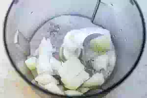 1. Печень вымыть, обсушить бумажными полотенцами, срезать протоки и жир. Луковицу очистить, крупно порезать и вместе с солью пюрировать в блендере.