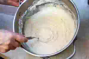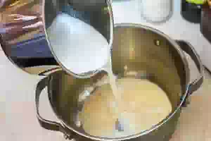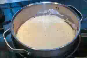 1. Манку залить третью от общего объема молока. Оставить на 15 минут. Добавить соль и сахар, хорошо перемешать.