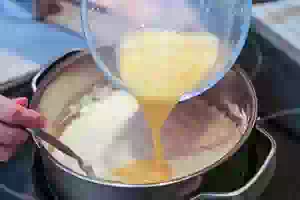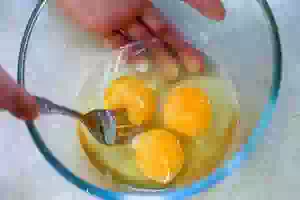 6. В отдельной миске размешать венчиком или вилкой яйца.