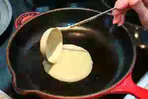 9. Разогреть сковороду, смазать растительным маслом и налить небольшой ковшик теста. Прикрыть сковороду крышкой и запекать на слабом огне, пока верх блинчика не покроется дырочками и тесто не схватится. Аккуратно перевернуть блин на другую сторону и продолжить запекать до готовности.