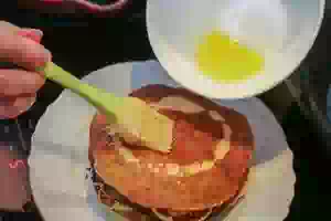 10. Снять блинчик со сковороды и сразу смазать растопленным сливочным маслом. Продолжать печь оладьи из остального теста, смазывая каждый растопленным маслом и складывая стопкой. Из перечисленных ингредиентов получилось 8 пышных оладий. Подавать их со сметаной или просто так.