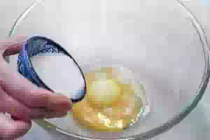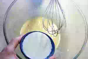 3. В другой миске растереть добела яичные желтки с остальным сахаром.