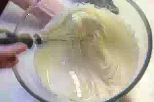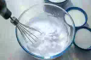 2. Взбить белки в устойчивую пену, добавив щепотку соли и примерно 1/6 часть сахара.