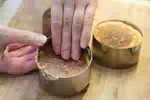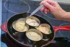 8. Разогреть сковороду на очень маленьком огне. Пока сковорода разогревается, смазать с внутренней стороны формы для панкейков (у меня металлические кольца для формовки салатов диаметр 7 см и высотой 5 см). Если нет готовых форм, то сделайте их из пекарской бумаги. Или пеките панкейки совсем без форм. Смазать сковороду растительным маслом, протереть бумажной салфеткой и установить формы. Наполнить формы тестом для оладий на 2/3 объема.