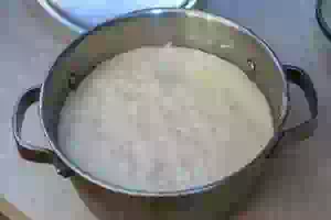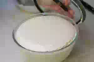 4. Миску с опарой прикрыть пищевой пленкой, сделать небольшое отверстие и оставить в теплом месте примерно на 1 час, пока она не поднимется шапкой.