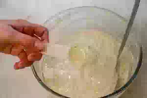 5. В отдельно миске размешать яйца венчиком или вилкой. Можно добавить немного соли. Перелить яйца в опару, размешать. Следом добавить оставшуюся просеянную муку, смешанную с солью.