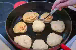8. Разогреть сковороду с растительным маслом и выкладывать столовой ложкой тесто. Чтобы тесто легко соскальзывало с ложки, смажьте её растительным маслом и намочите водой. Между дрожжевыми оладьями обязательно оставляйте промежутки, чтобы они не слиплись во время жарки. Жарить на небольшом огне, так оладьи заметно увеличатся в объеме, гарантированно пропекутся и останутся пышными даже, когда остынут. Готовые оладьи на дрожжах подавать с любым соусом, вареньем или сметаной.