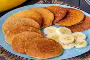 8. Банановые оладьи без муки и сахара готовы. Выложите их на тарелку, по желанию украсьте ломтиками банана и подавайте к столу.