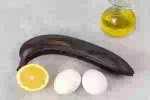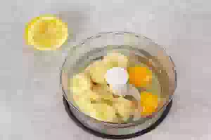 2. Из лимона отожмите примерно 1 ст. ложку сока. Банан очистите от кожуры, поломайте на кусочки и поместите в чашу блендера. Добавьте яйца и лимонный сок.