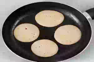4. Разогрейте антипригарную сковороду на огне чуть ниже среднего и кисточкой смажьте тонким слоем растительного масла. Порциями, по 1 ст. ложке, выложите банановое тесто на сковороду, прикройте крышкой и готовьте примерно 3 минуты, пока поверхность оладий не станет матовой.