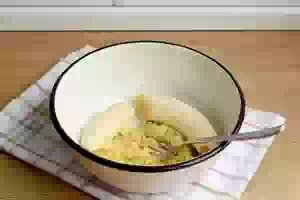 6. Влейте кефирно-банановую массу в миску с мукой.