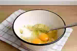 4. В миску с бананами добавьте сахар и яйца. Тщательно перемешайте до однородности.