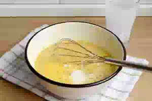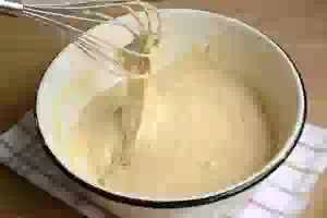 7. Тщательно перемешайте до однородности с помощью венчика. Тесто получается довольно густым и вязким, венчик оставляет на поверхности борозды и тянется за ним.