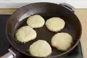 8. В сковороде разогрейте растительное масло. Выкладывайте на сковороду примерно по 1-2 ст. ложки теста, формируя оладьи. Жарьте на среднем огне (у меня это 5 из 9 делений электроплиты) примерно 1,5-2 минуты, до появления пузырьков на поверхности оладьев.