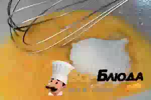 2. Всыпьте муку и соду, перемешайте до однородности.