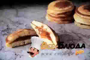 7. Сразу же накройте вторым оладушком, пока они еще горячие и плотно сожмите. Вот такая красота получилась! Можно подавать оладушки с начинкой в домашних условиях к столу.