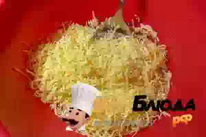 1. Рассол от огурцов налейте в чашку и всыпьте соду. Хорошо перемешайте. Твердый сыр натрите на средней терке и добавьте к рассолу.