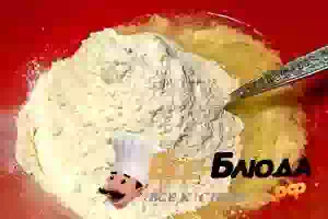 3. Хорошо перемешайте и добавьте, порциями, просеянную пшеничную муку. Количество муки может понадобиться несколько другое. Всё зависит от влажности муки и качества сыра.
