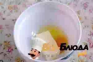 1. Включаем печь на 180С. В глубокую миску выкладываем мягкое сливочное масло. Добавляем сырое яйцо.
