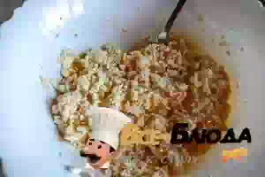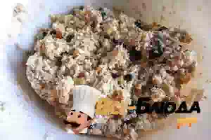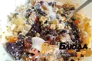 2. Добавьте творог и любые сухофрукты на ваш вкус (изюм, сушеная вишня, курага, чернослив, орехи, семечки). Примешайте разрыхлитель и щепотку соды.