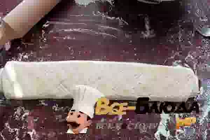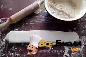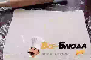2. Рабочую поверхность посыпаем мукой и раскатываем на ней тесто в прямоугольник.