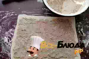 3. На раскатанное тесто равномерно выкладываем начинку, оставляя свободными несколько сантиметров по краям.