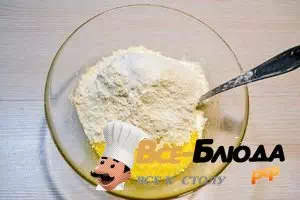 5. Частями добавляйте просеянную муку с разрыхлителем. Сначала ложкой размешайте тесто.