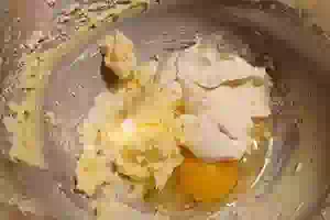 2. Добавить яйцо и густую сметану, продолжить взбивать до однородности.