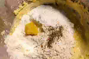 3. Сухие ингредиенты - муку, соль, разрыхлитель, молотый кардамон смешать с масляной смесью. Добавить тертый имбирь. Замесить однородное мягкое тесто. По необходимости добавить еще немного муки.
