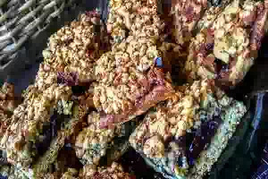 9. Сразу после того, как противень извлечен из духовки, корж разрезать на небольшие квадратики. Украсить готовое песочное печенье с вареньем сахарной пудрой или щепоткой молотой корицы. Домашнее песочное печенье с вареньем можно подавать к чаю сразу, пока оно горячее, или охлажденным.