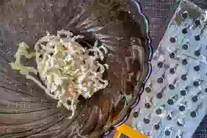1. В первую очередь маргарин для печенья натирается на крупной терке. Для удобства он должен быть не комнатной температуры, а слегка замерзшим.