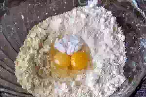 4. Далее в песочной основе делается лунка, куда добавить сырые яйца и соду, гашенную уксусной кислотой. Все ингредиенты замесить в тугое и достаточно жирное тесто.