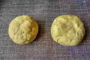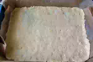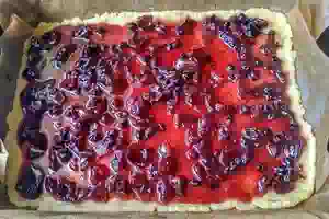 6. Вторую часть песочного теста тонко раскатать и поместить на дно противня, проложенного пекарской бумагой или пергаментом с растительным маслом.