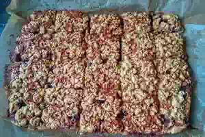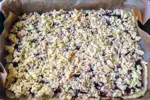 8. Вторую, слегка затвердевшую часть теста натереть на крупной терке и равномерно распределить поверх варенья. После чего противень отправляется в духовой шкаф буквально на 12-14 минут при температуре в 200С.
