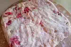 3. Влейте 240г кефира или йогурта и размешайте руками, чтобы не было остатков сухой смеси. Замешивайте аккуратно, чтобы ягоды остались максимально целыми. Тесто не должно быть слишком однородным.