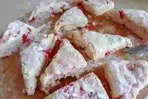 4. Переложите тесто на чистую рабочую поверхность, припыленную мукой, и сформируйте небольшой квадрат высотой 1.5 см. Разрежьте сразу на 4 равных квадрата, затем каждый вдоль и еще раз пополам. В итоге должны получиться маленькие треугольники. Размешайте яйцо с 30г молока и смажьте заготовки. Переложите на противень, застеленный бумагой для выпечки, и выпекайте около 30 минут при 190С. Наслаждайтесь мягким печеньем из теста на кефире с цукатами вместе с любимым ароматным чаем.