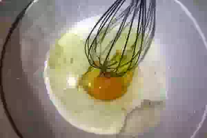 1. Для начала достаем кефир из холодильника, чтобы он немного согрелся. Соединяем в миске кефир, растительное масло, яйцо, соль и сахар. Все хорошо перемешиваем венчиком.